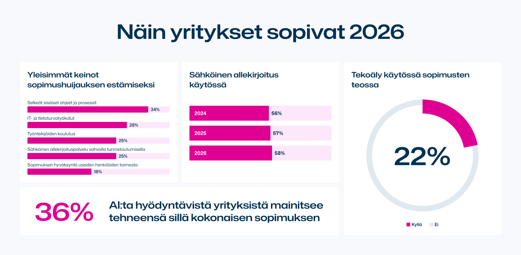 Tutkimuksen mukaan yleisimmin käytettyjä keinoja sopimuksiin liittyvien petosten estämisessä ovat sisäiset ohjeistukset sekä IT- ja tietoturvatyökalut. Vain joka neljäs suomalaisyritys käyttää sähköistä allekirjoituspalvelua petosten torjuntaan, vaikka allekirjoituspalvelu on käytössä yli puolella (58 %) tutkituista yrityksistä.